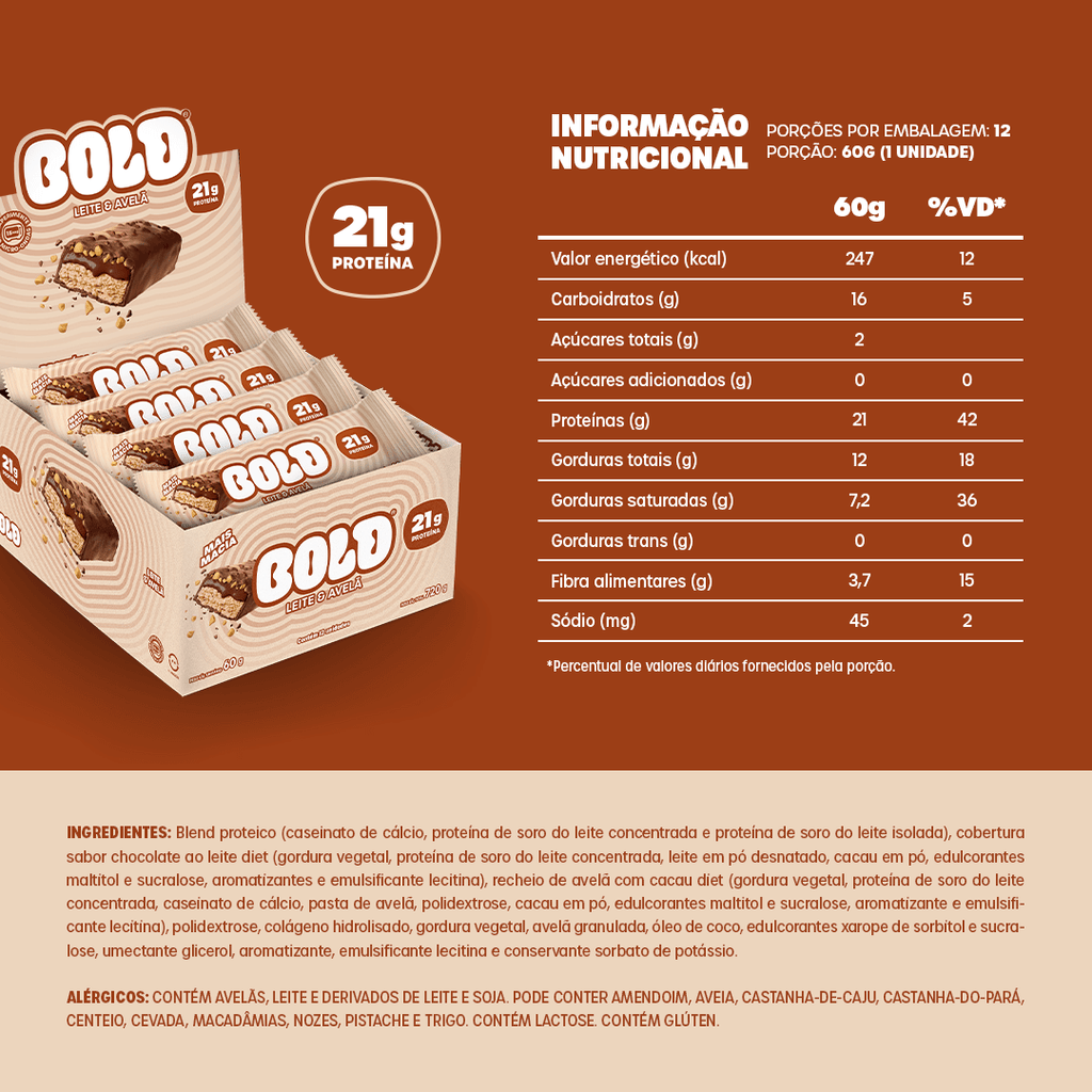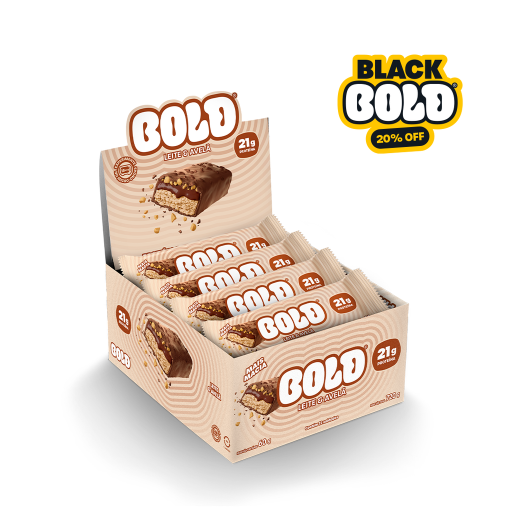 Caixa de barra de proteína BOLD sabor Leite & Avelã, a combinação perfeita para o lanche. Recheio irresistível com pedacinhos de avelã e uma deliciosa cobertura de chocolate. Barra de proteína zero açúcar adicionado, perfeita para dietas e como alimento pós-treino.