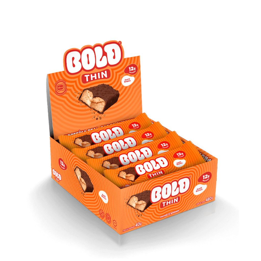 Caixa de barra de proteína BOLD Thin sabor Avelã Branco, a escolha perfeita para amantes de doces clássicos. Tem um recheio delicioso de leite com avelã com um toque amanteigado e uma deliciosa cobertura de chocolate ao leite. É o doce proteico perfeito para levar em shows, trilhas, ou para comer depois do treino.