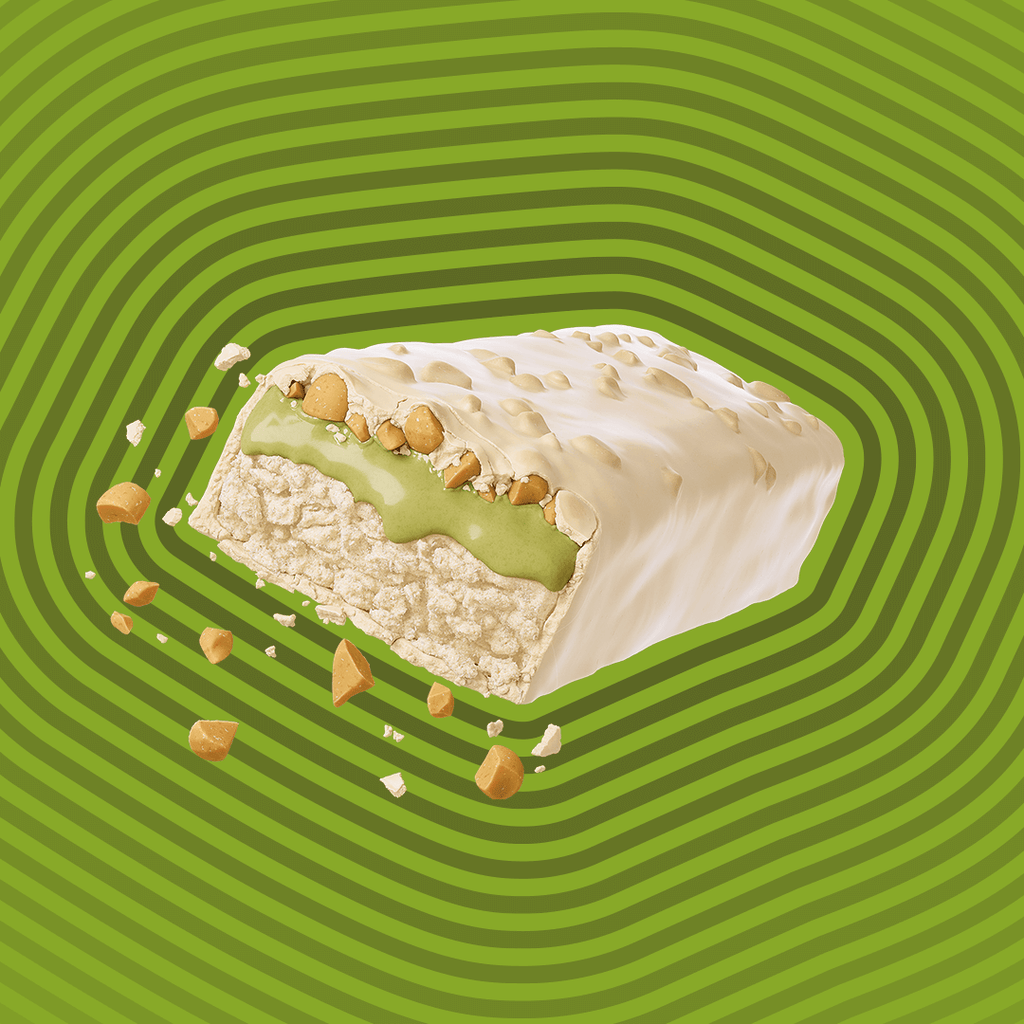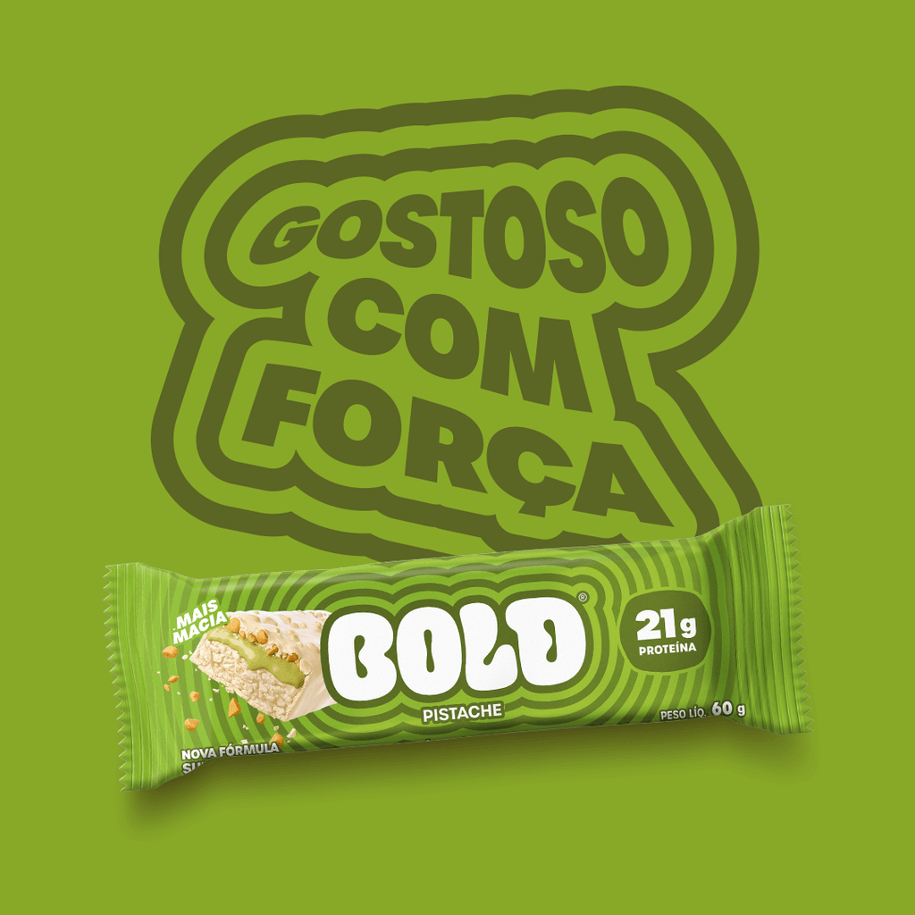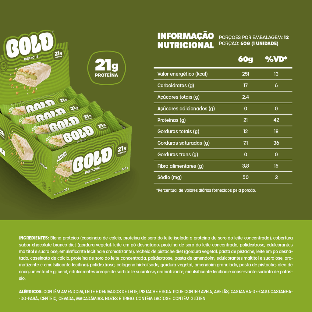 Caixa de barra de proteína BOLD Pistache, uma versão saudável e proteica do doce mais amado! Tem textura incrivelmente macia com recheio de pistache cremoso, pedacinhos de castanha e cobertura de chocolate branco diet. Fonte de proteína para o dia a dia, é a barrinha ideal para consumir como lanche pré-treino.